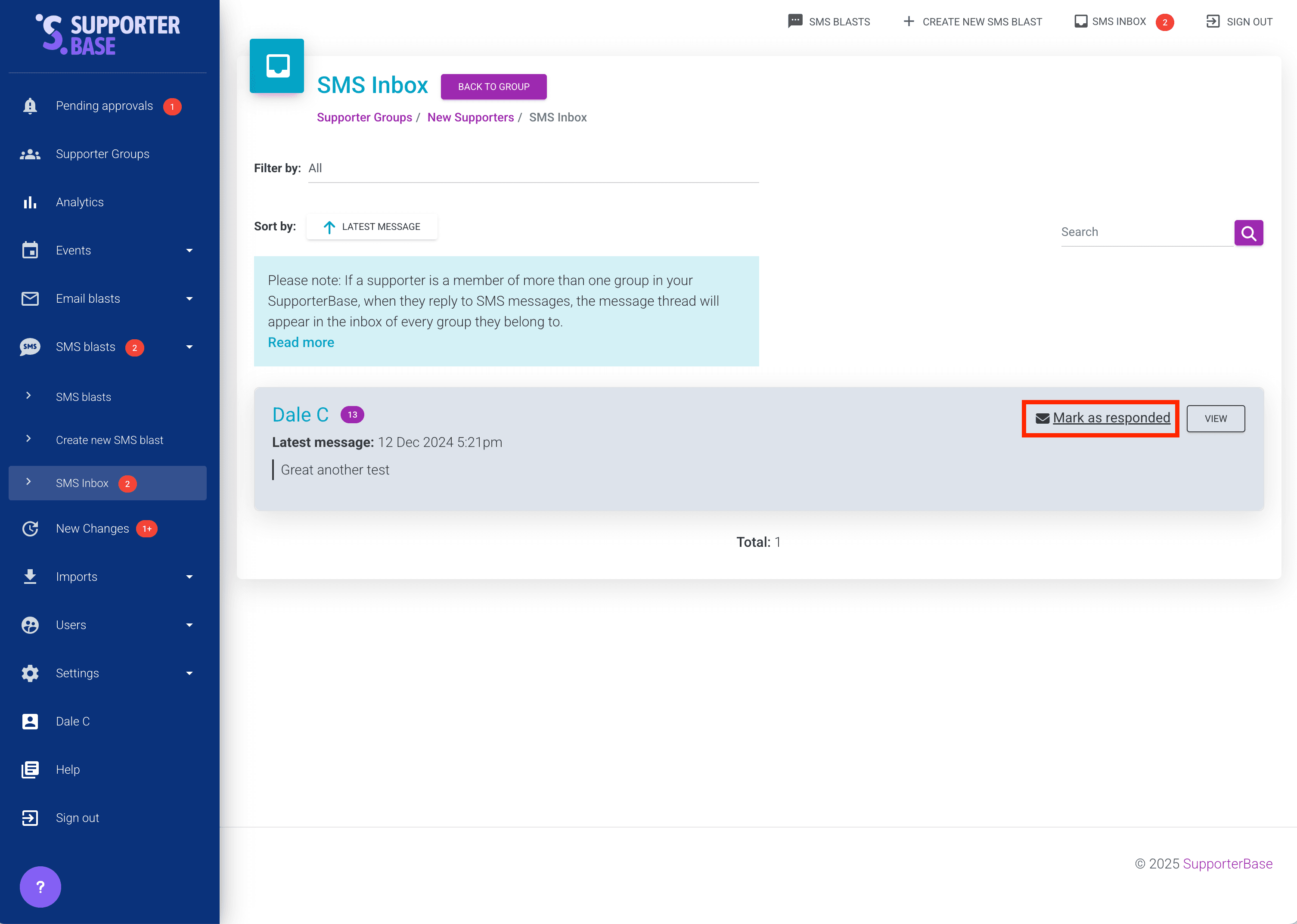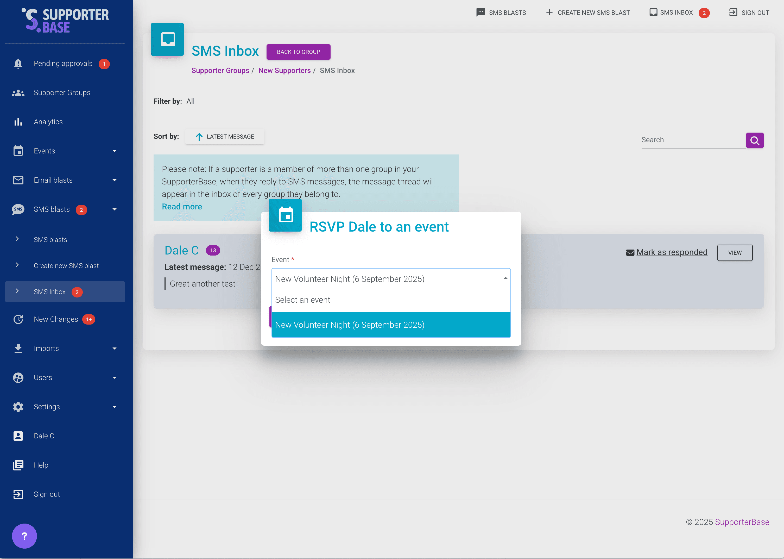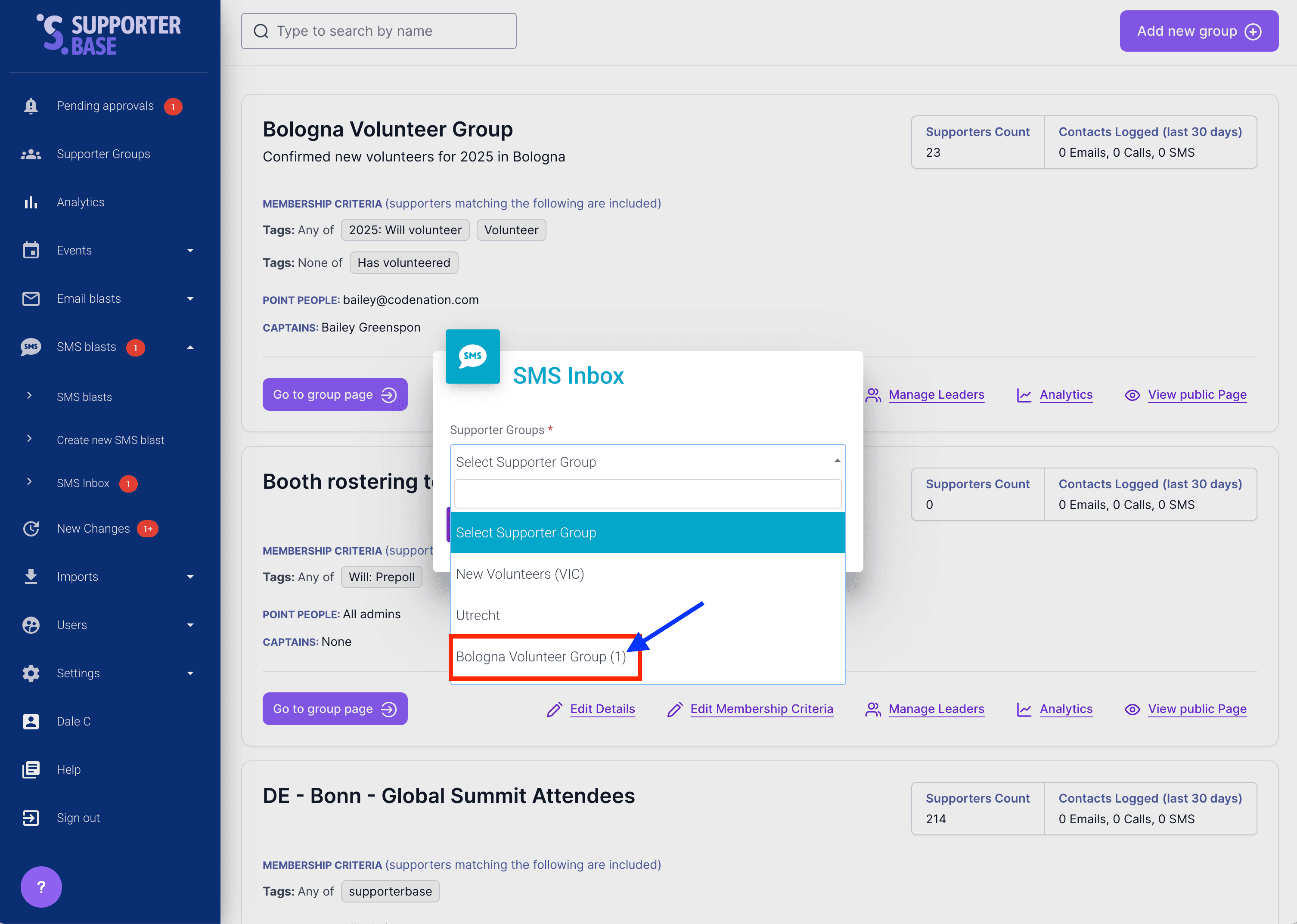 SMS threads: If a supporter belongs to multiple groups, their SMS replies appear in the inbox of every group they are part of. All groups share a single organisation-wide phone number (via Twilio). The only way to isolate replies to a single group would be to purchase dedicated Twilio numbers per group (a decision for your organisation).