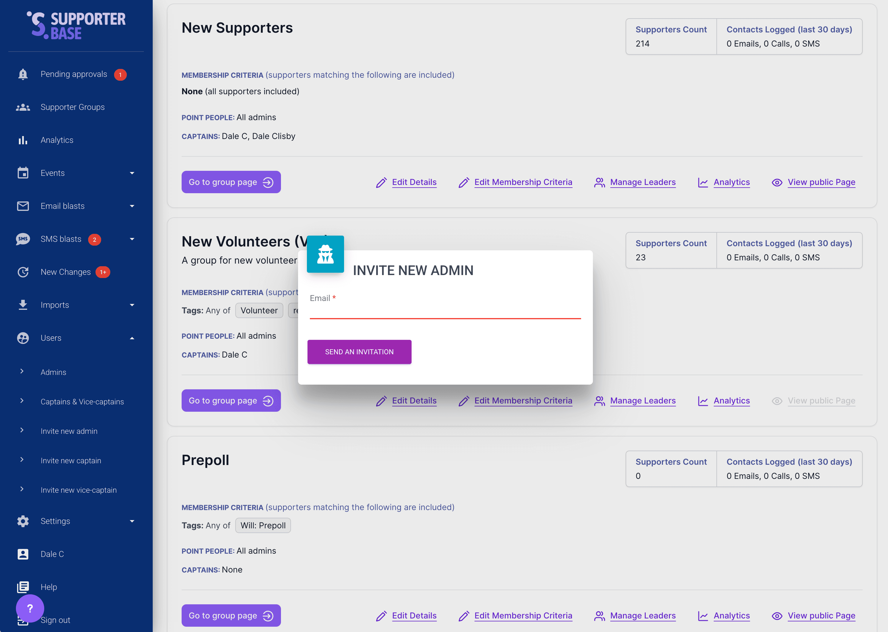 View, invite, and manage admins, captains, and vice-captains in your SupporterBase