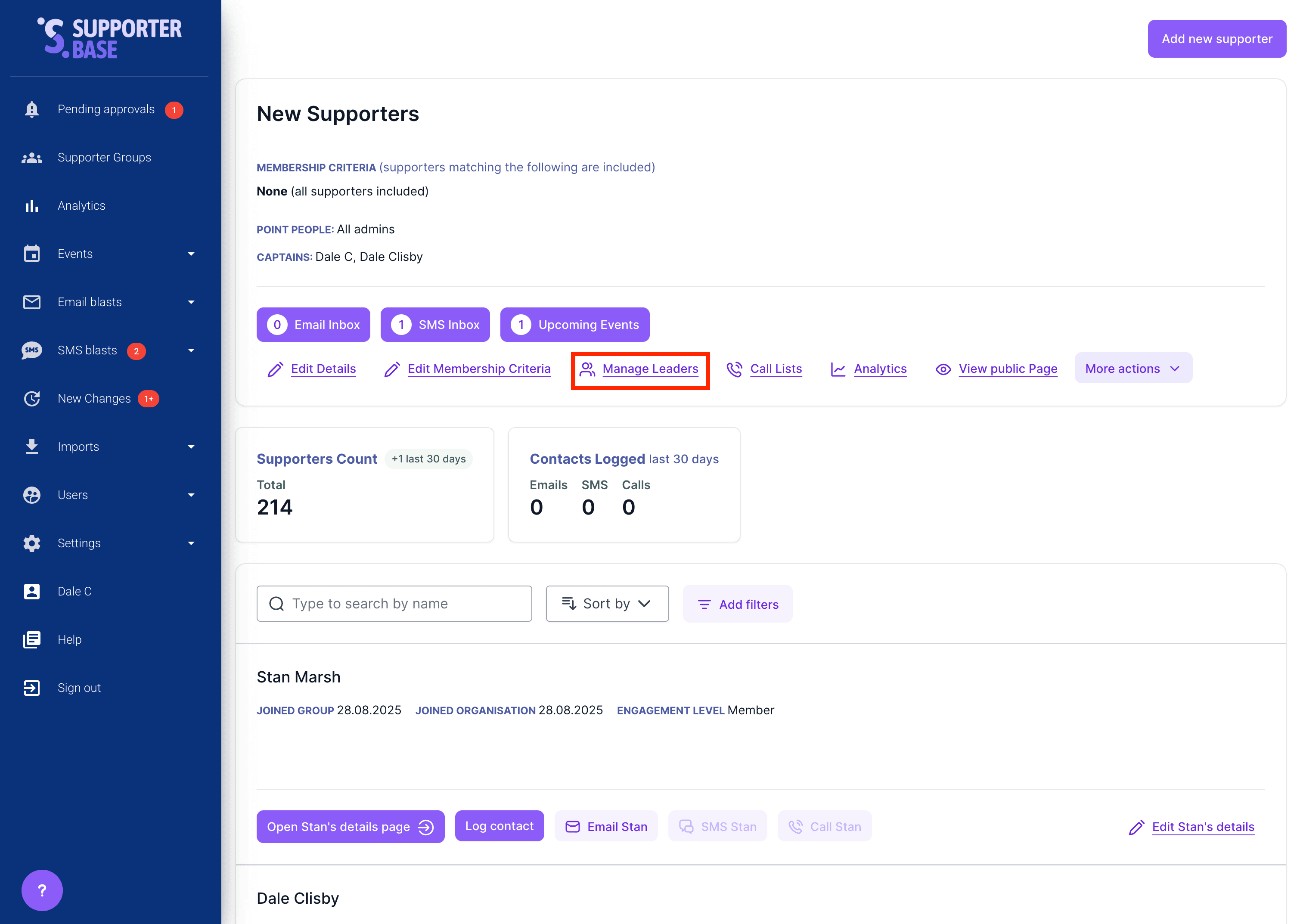 This guide covers how to view, invite, and manage leaders in SupporterBase, including admins, captains, and vice-captains.