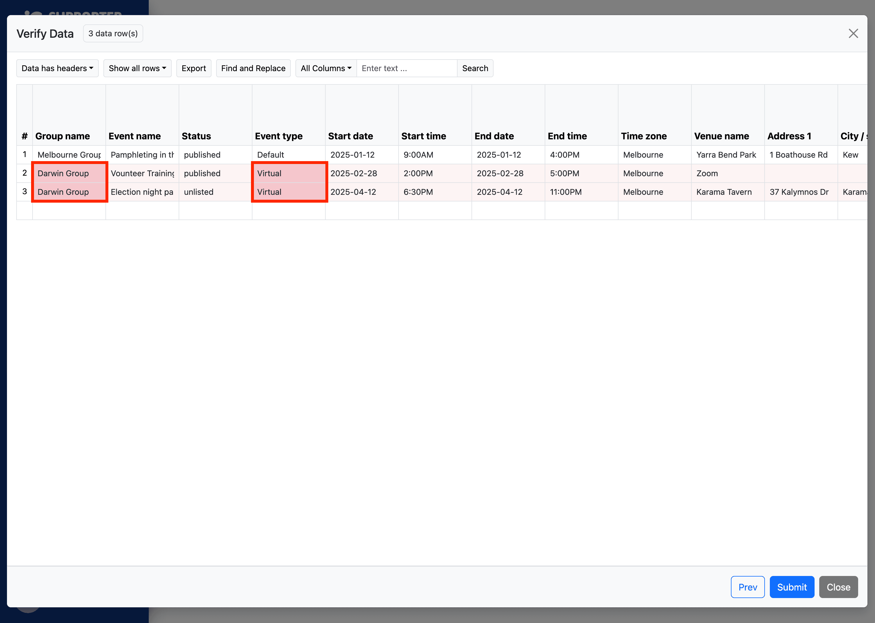 If there are errors (e.g. missing group names, invalid dates), they will be highlighted so you can fix them before final submission.