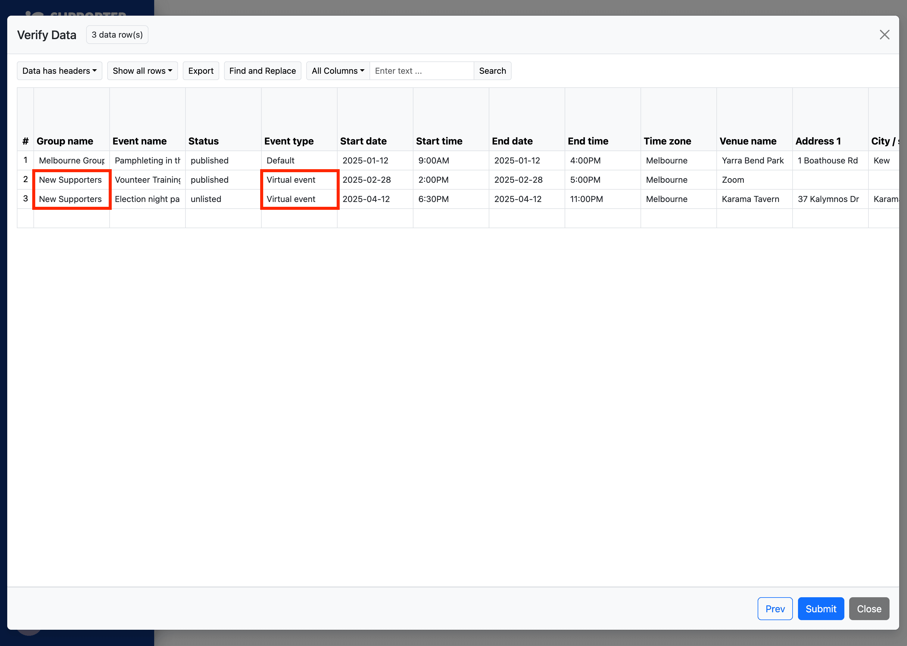 For large efforts (like multi-day events, festivals, or days of action), you can save time by importing events with their shift data in bulk instead of creating them one by one.