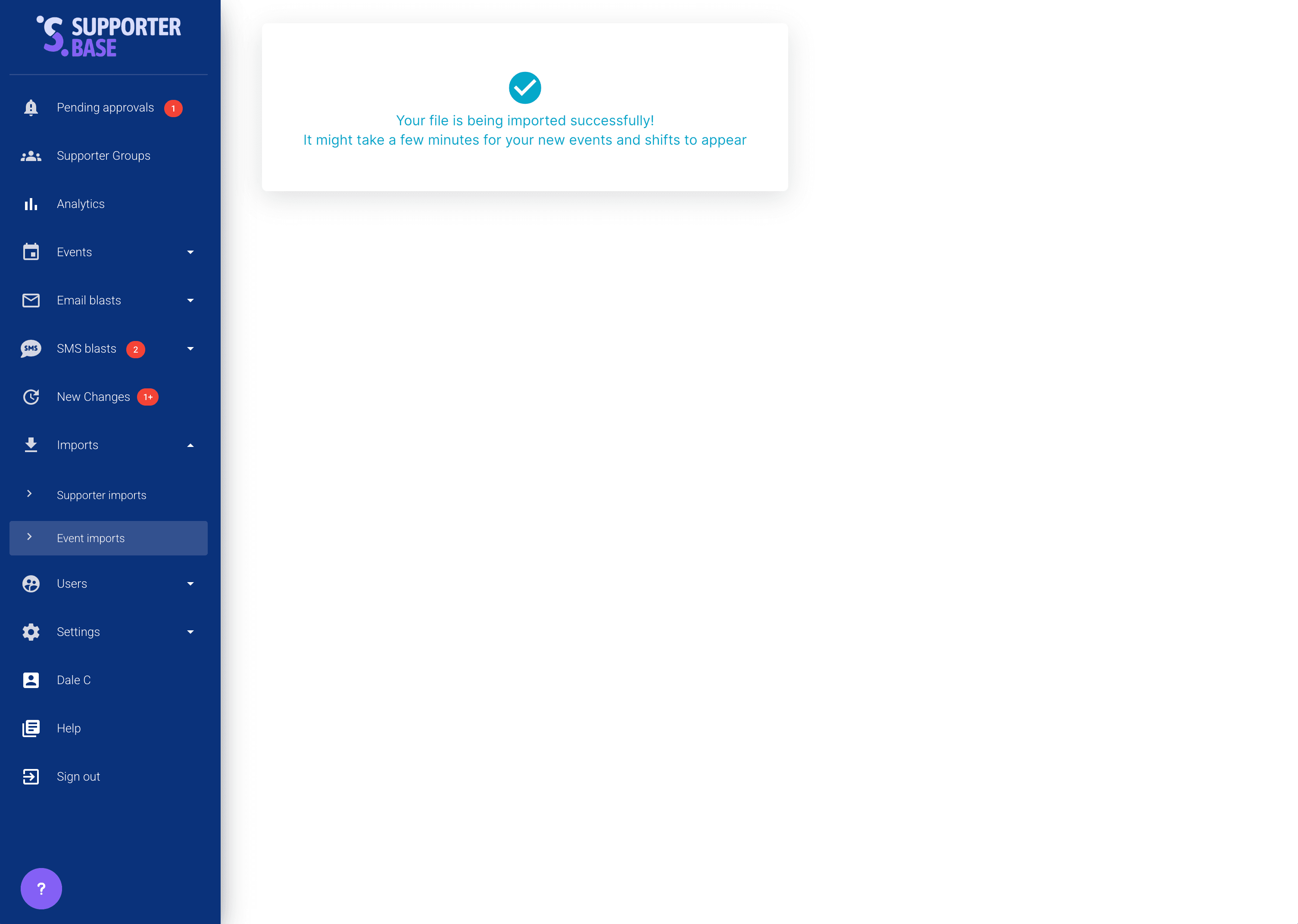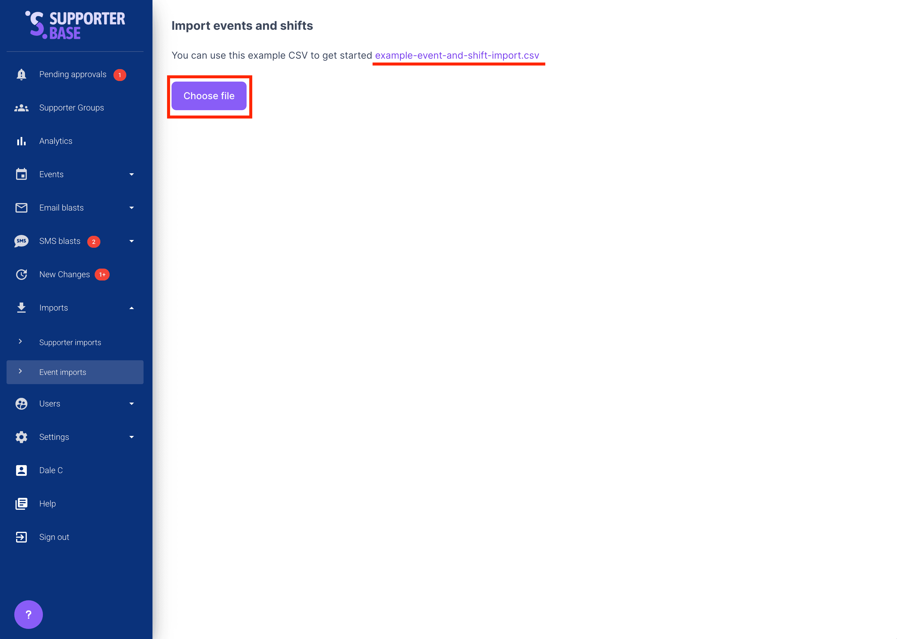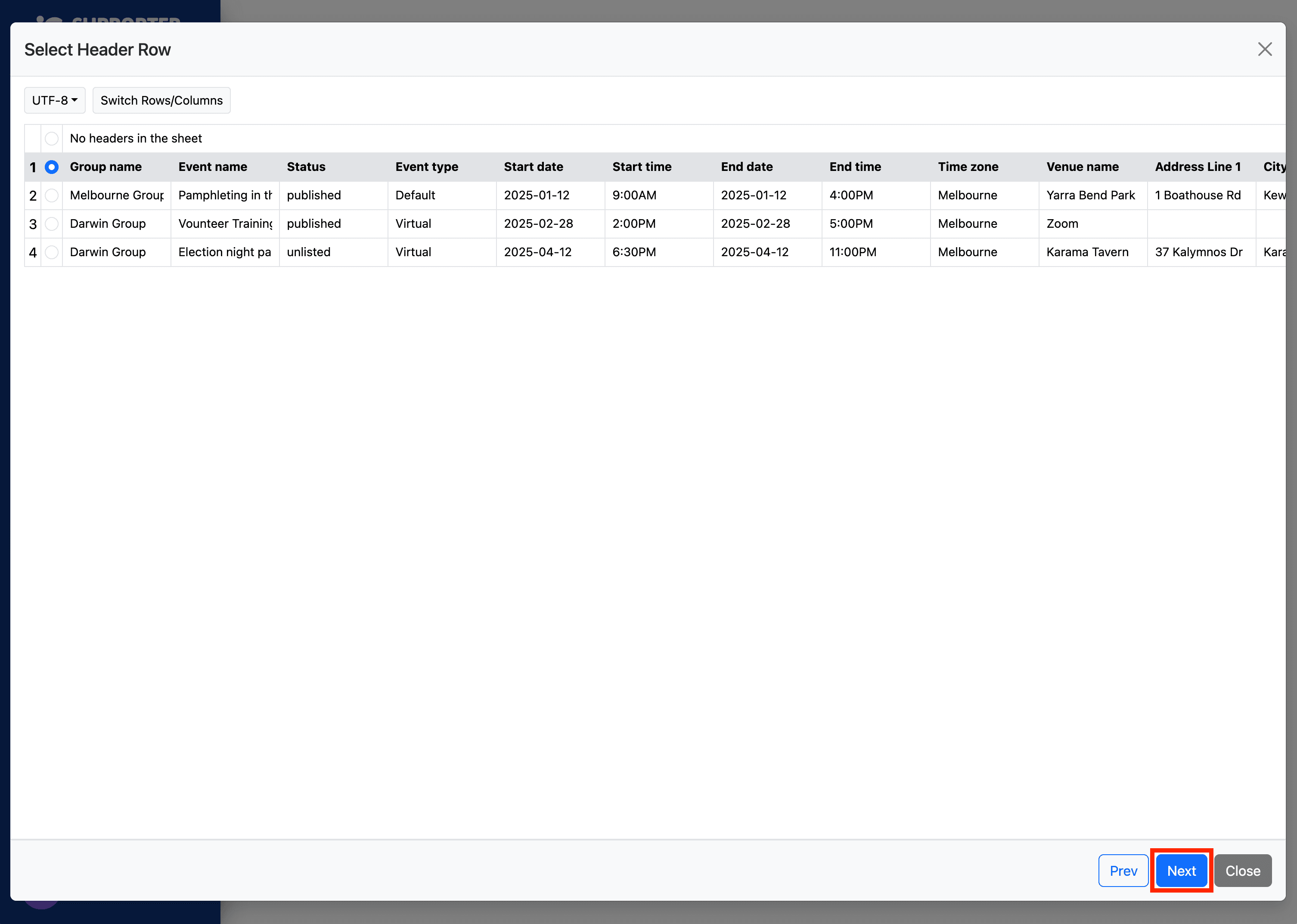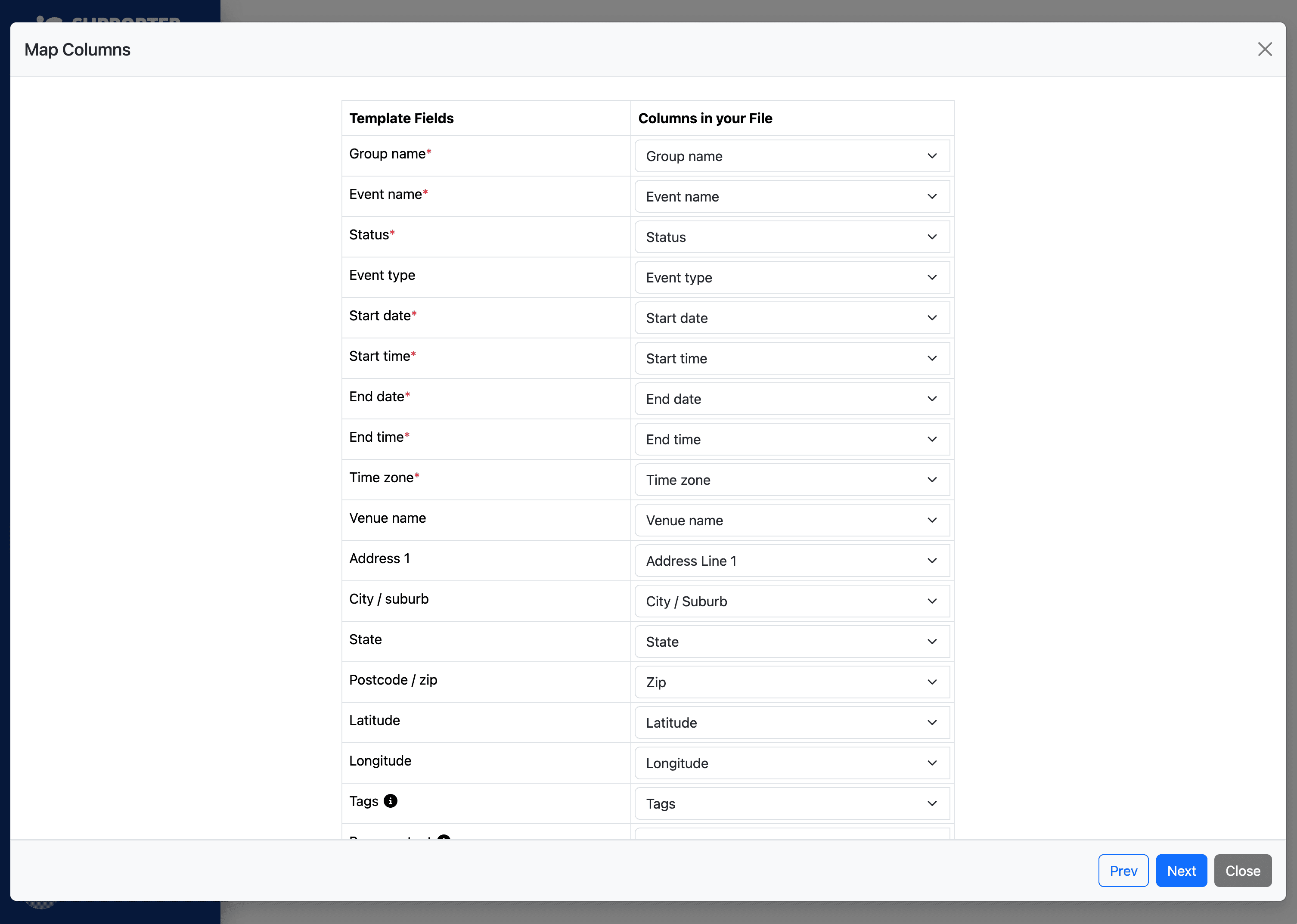 Map the fields from your spreadsheet to the correct SupporterBase fields (e.g. Event name, Date, Start time, End time, Role, Shift count).