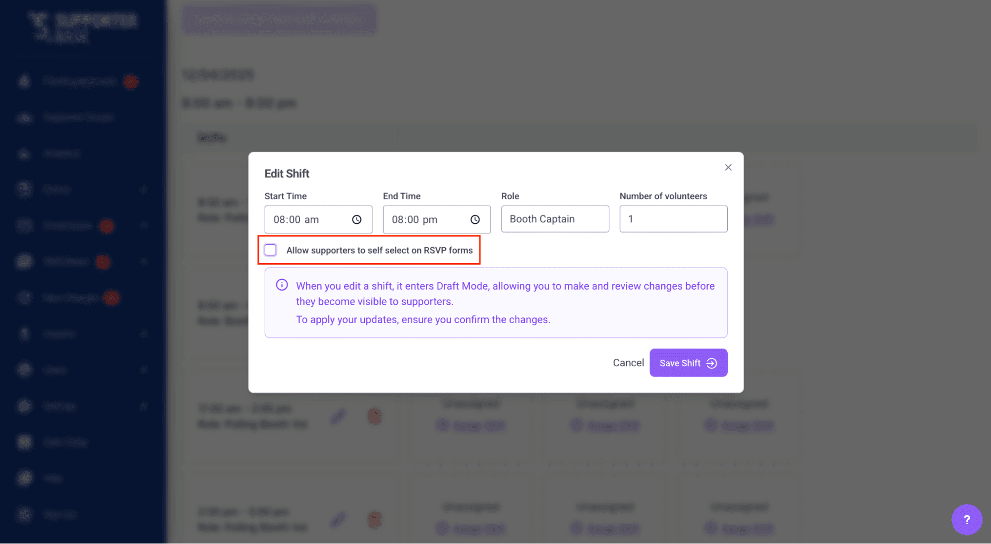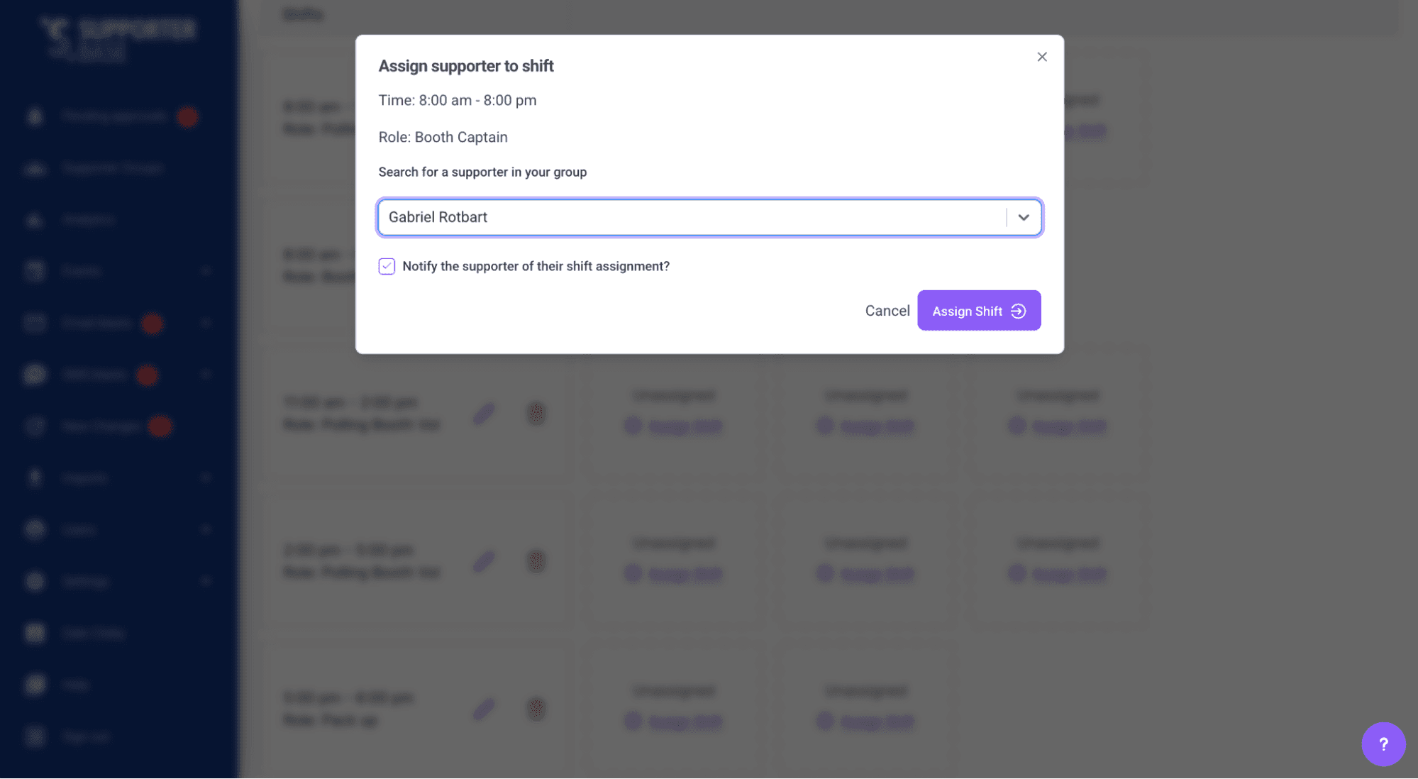 - Edit shifts or roles at any time (with the option to notify supporters of changes)