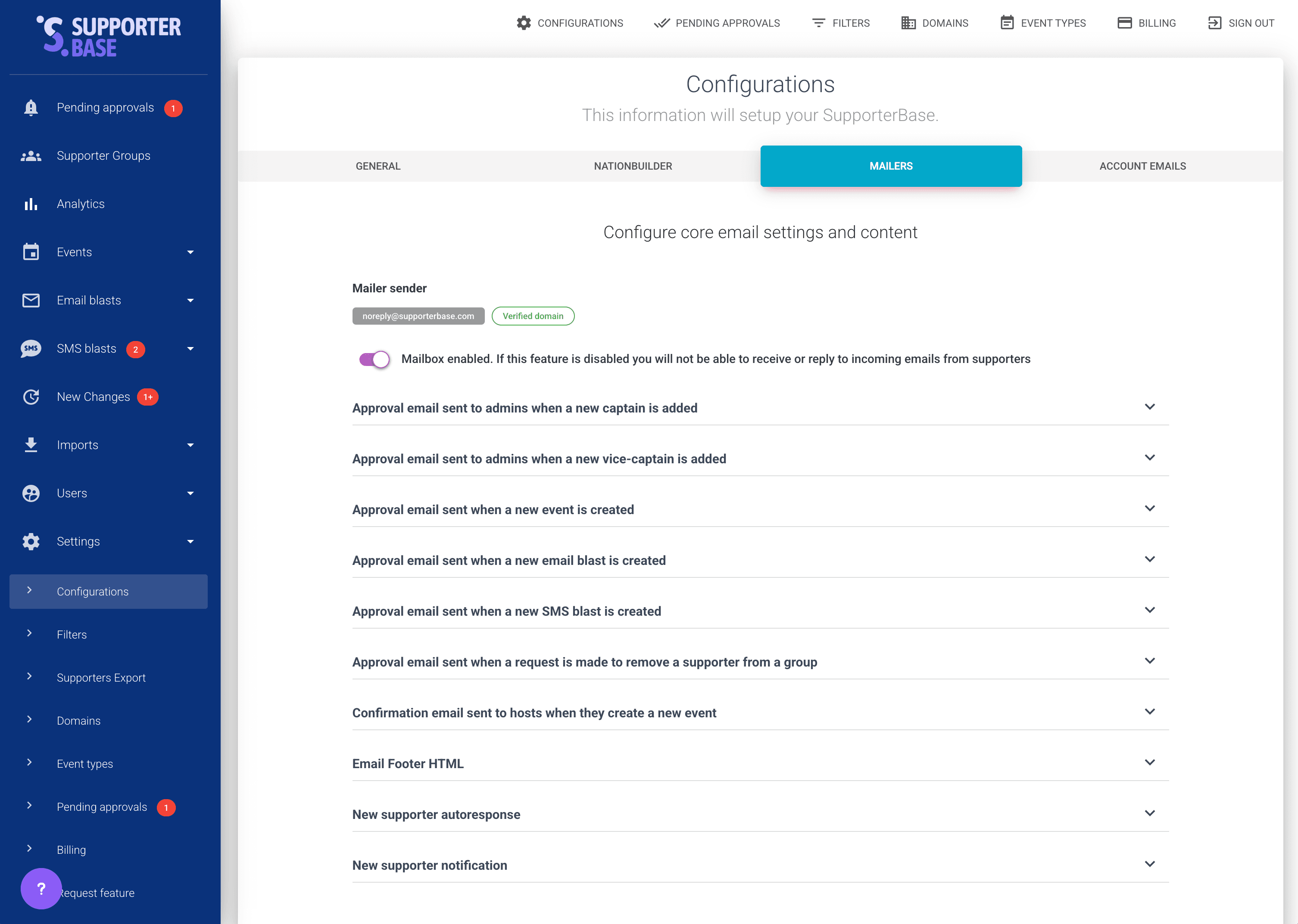 - Go to Settings > Configurations > Mailers.