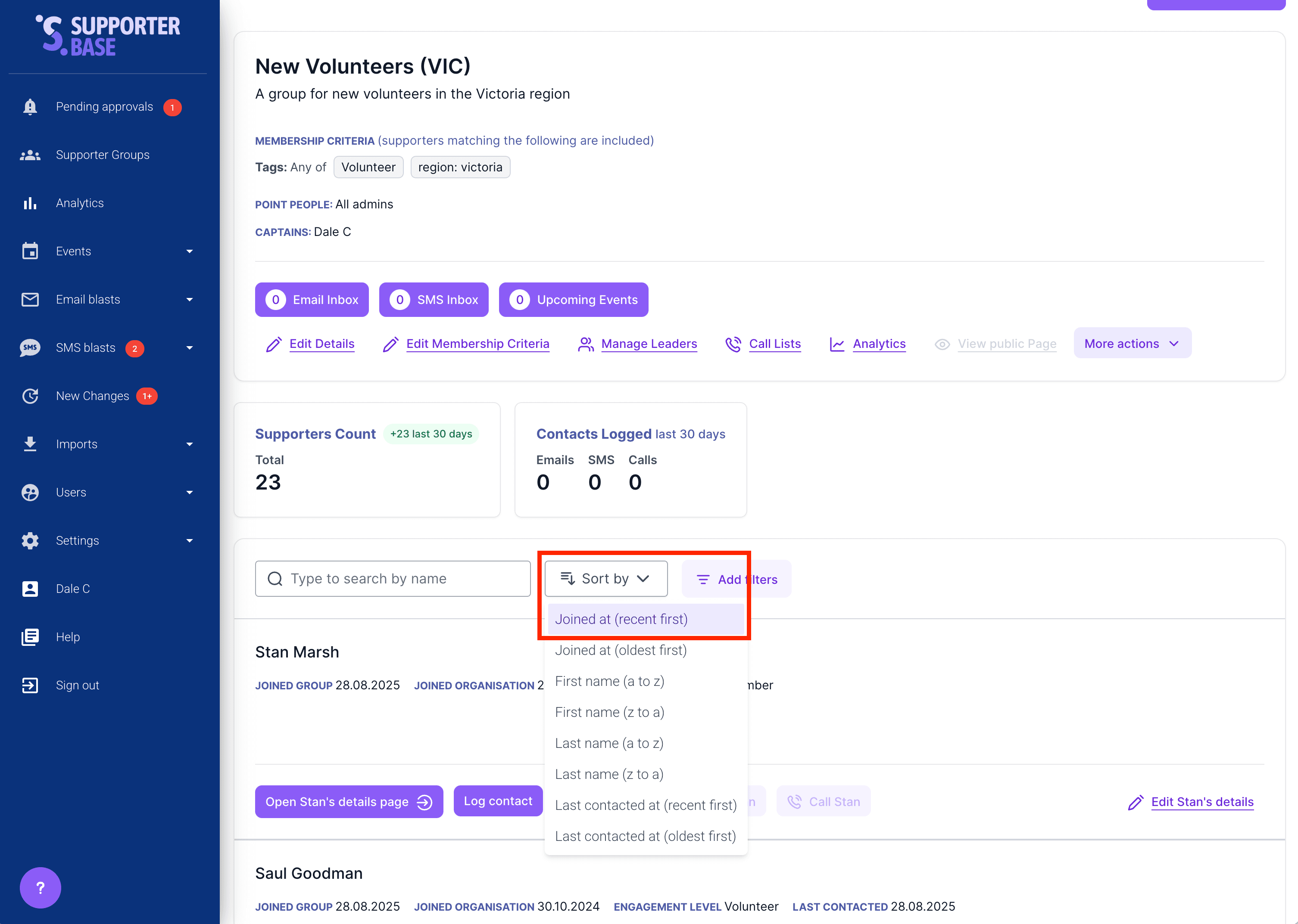 Leaders can use supporter profiles and filters to see when people joined: